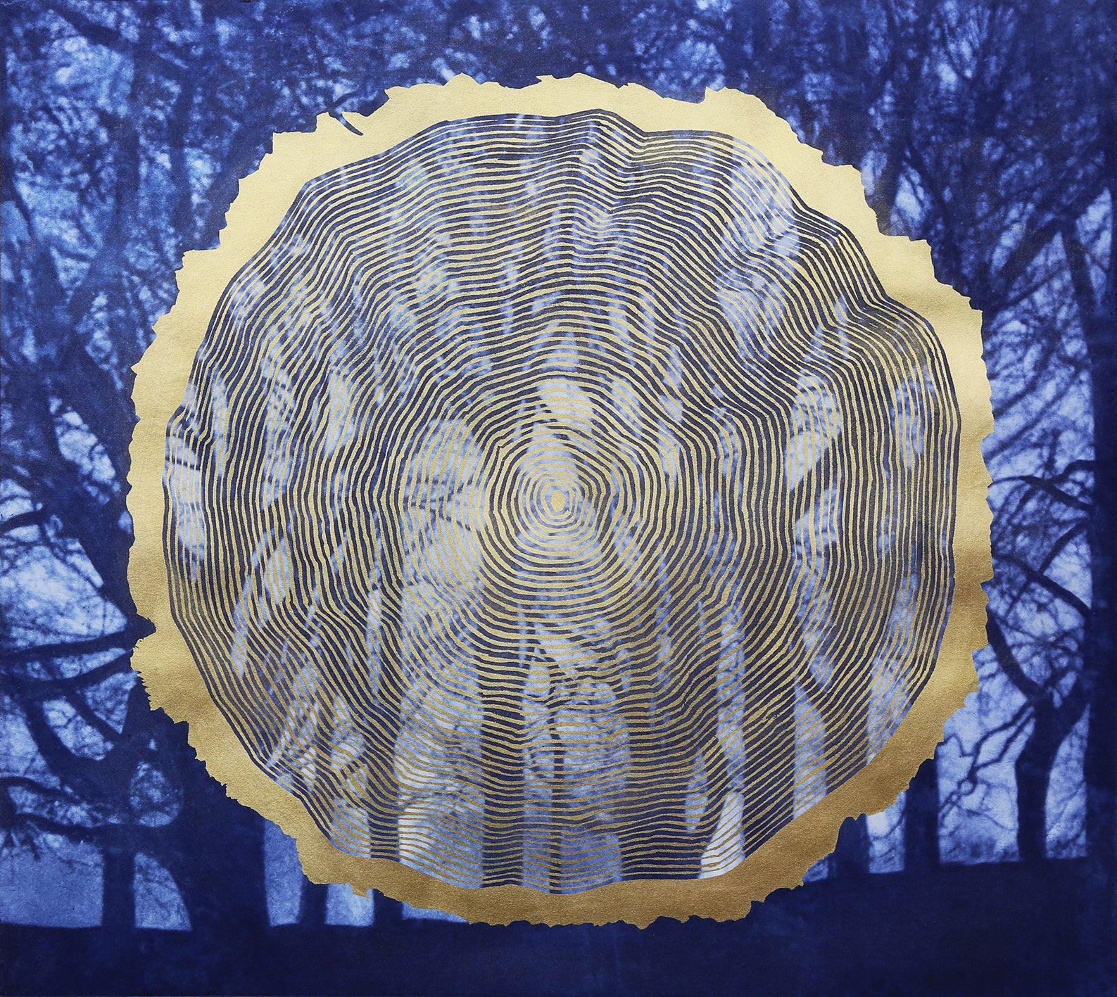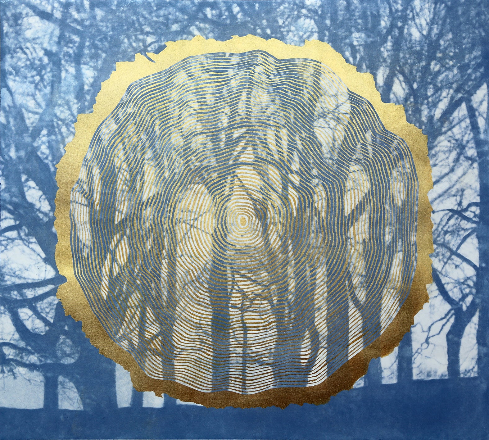 Photopolymer etching and Screenprint with gold pigments, created and hand printed on Fabriano Paper, signed and numbered on the front. The tree cut is actually printed using fresh gold pigments, which give it a natural gold colour and varies according to the direction of the light. A Journey exists in different colour variations.