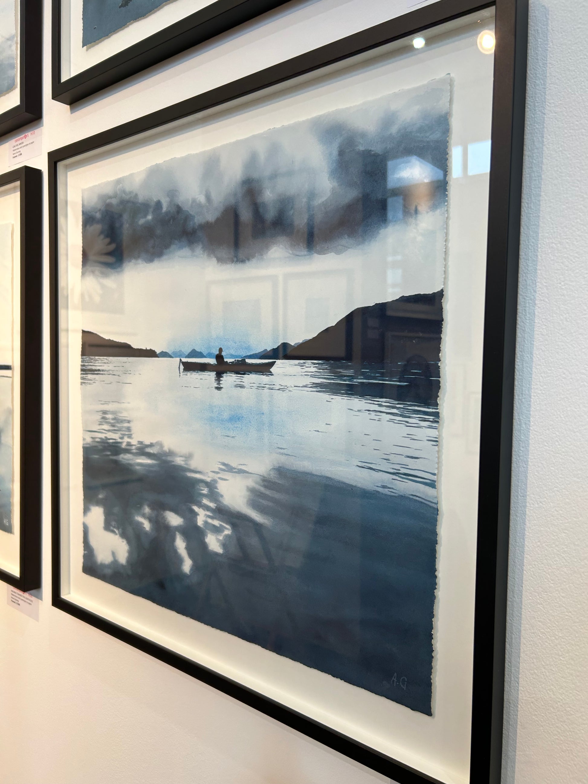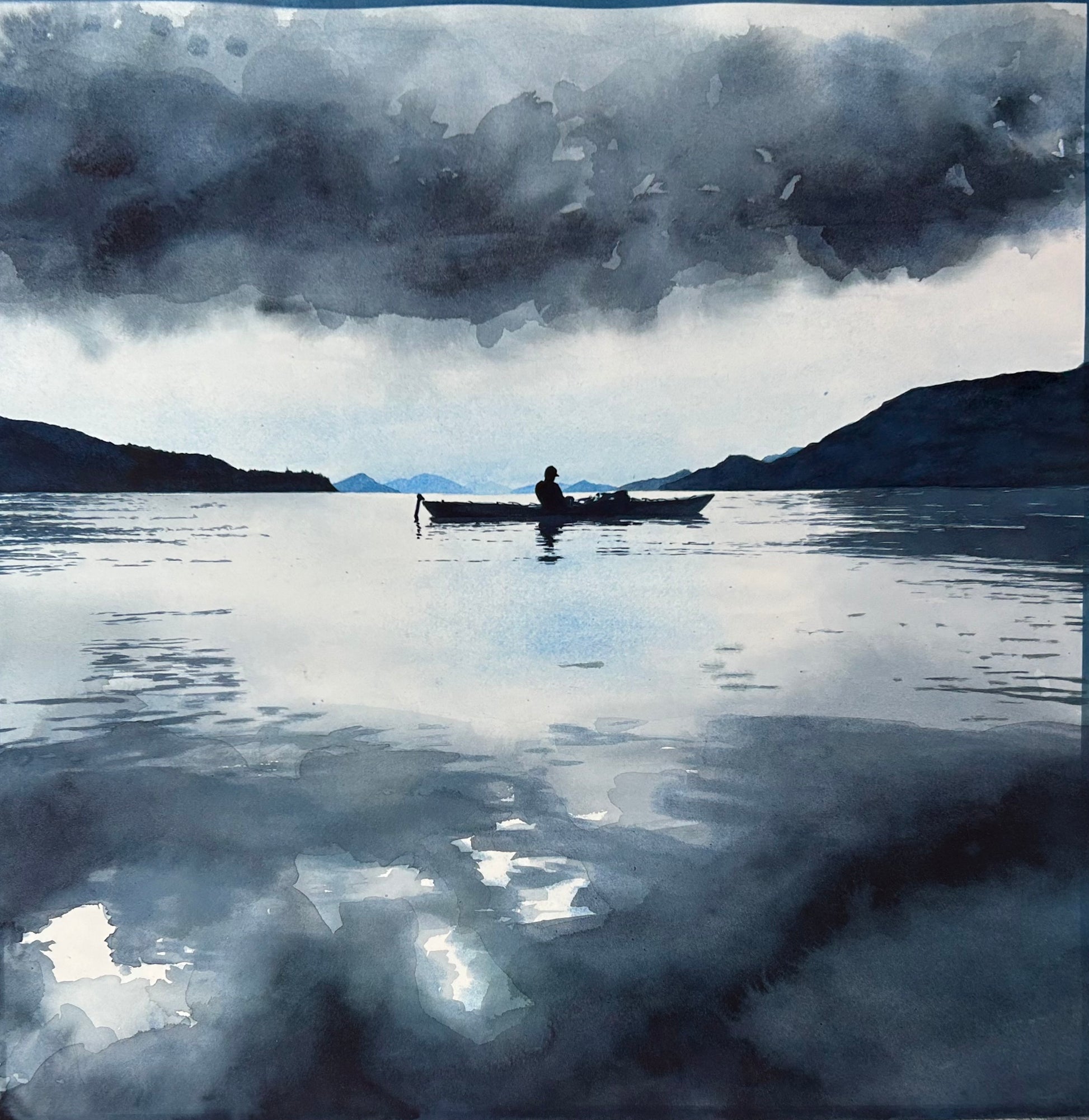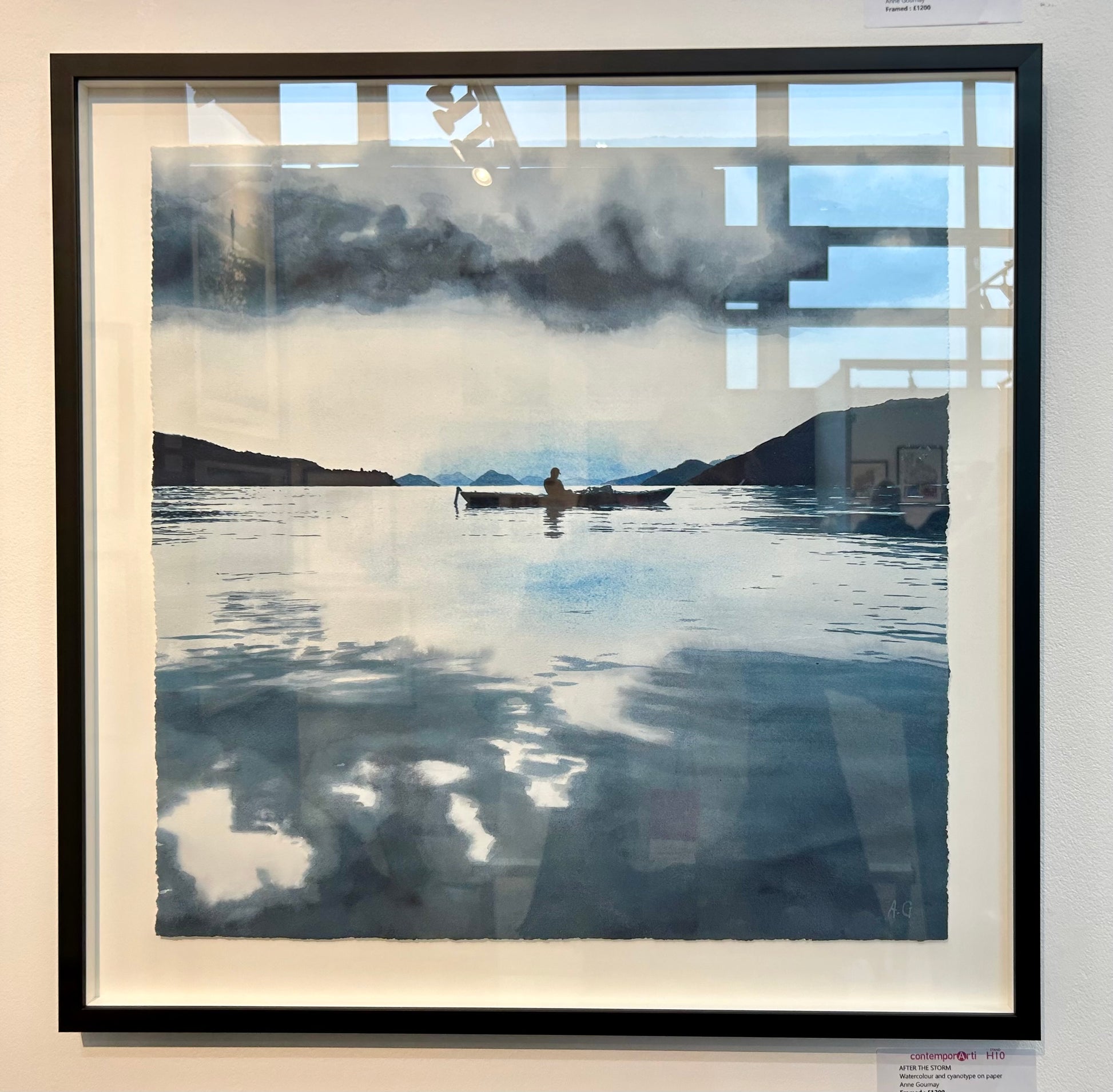 This painting started as a hand made cyanotype print, to which Anne added watercolour to modify the contrast, atmosphere and mood of the artwork. Therefore, each painting in this series is unique.