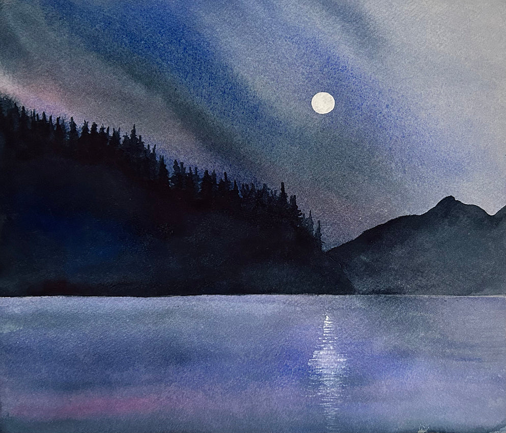 A Watercolour inspired by a canoeing trip on the Johnstone Strait. I tried to communicate the feeling of belonging one can have in this awe-inspiring environment, where one is immersed in wilderness, surrounded by thousand year-old trees.