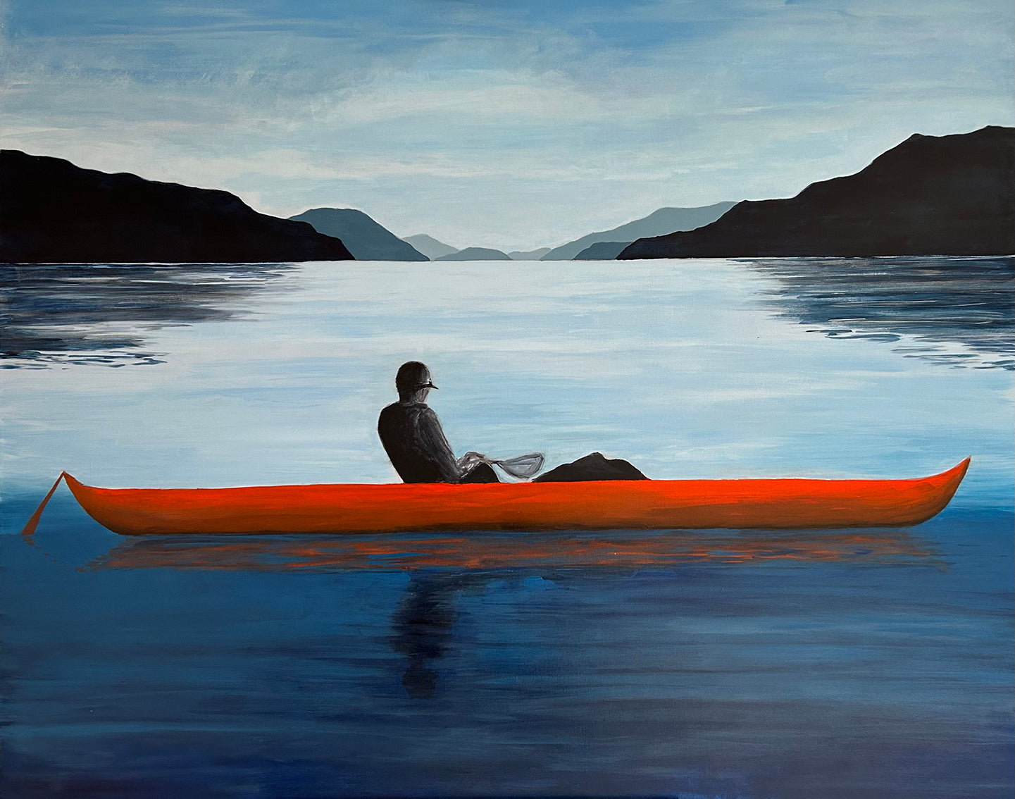 Acrylic painting on a deep edge canvas. Inspired by a trip to the Johnstone Strait, off Vancouver Island, trying to catch a glimpse of the orcas and the dolphins. A very meditative painting reflecting the feeling of belonging we can have when totally immersed in nature.