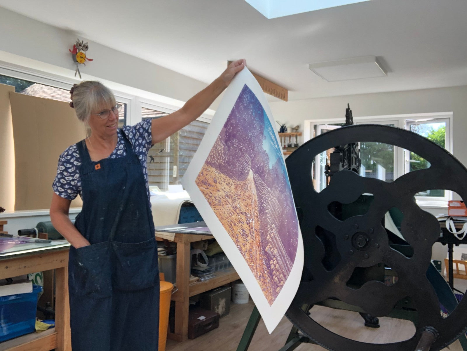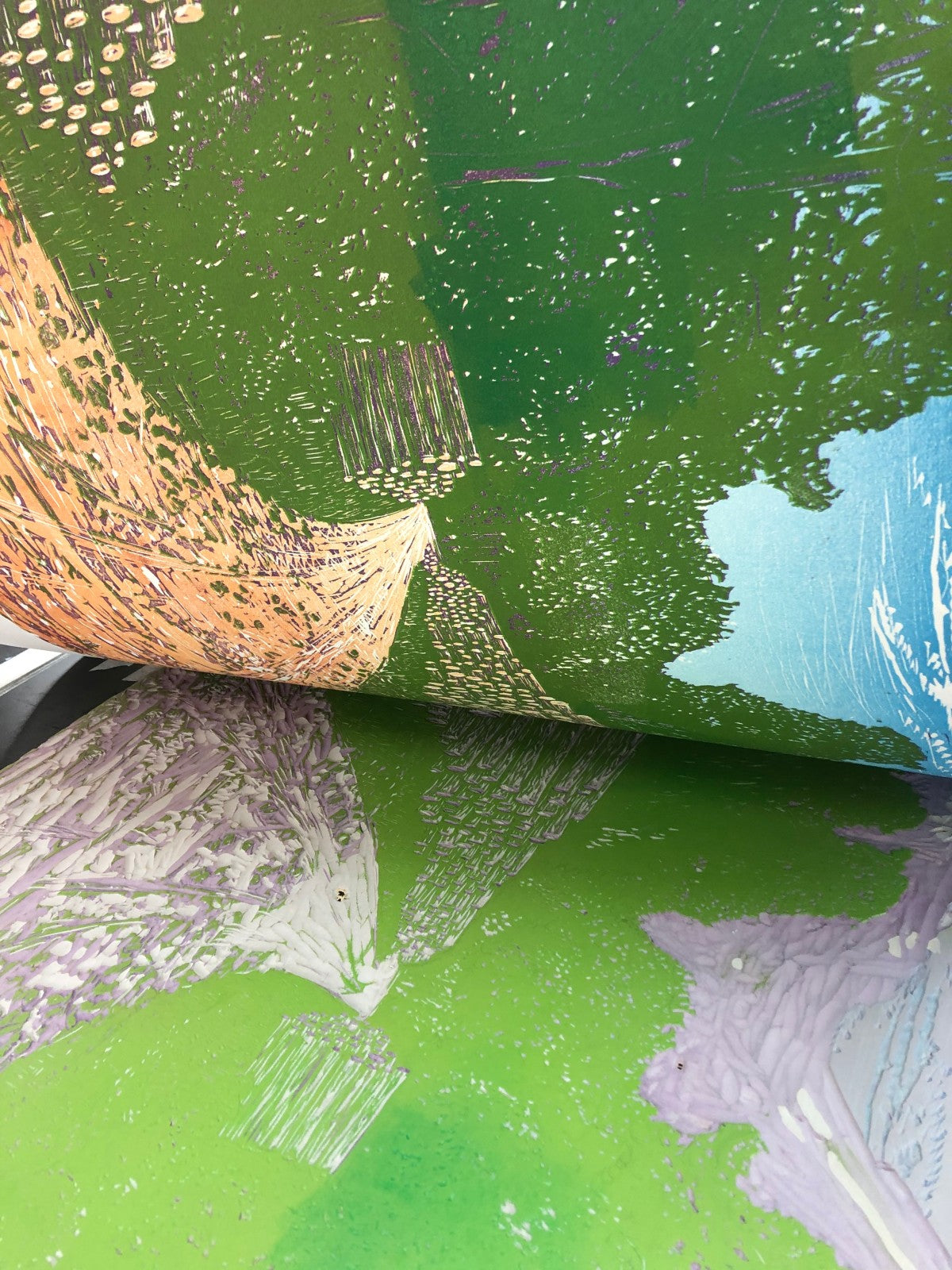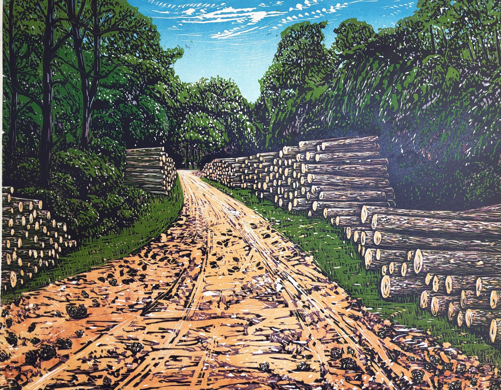 A reduction linocut by Louise Stebbing, inspired by a walk in the woods in Thetford Forest Louise did at the end of May 2020. Designed and hand printed by Louise Stebbing, in a small edition of only 8 prints, all signed and numbered on the front.