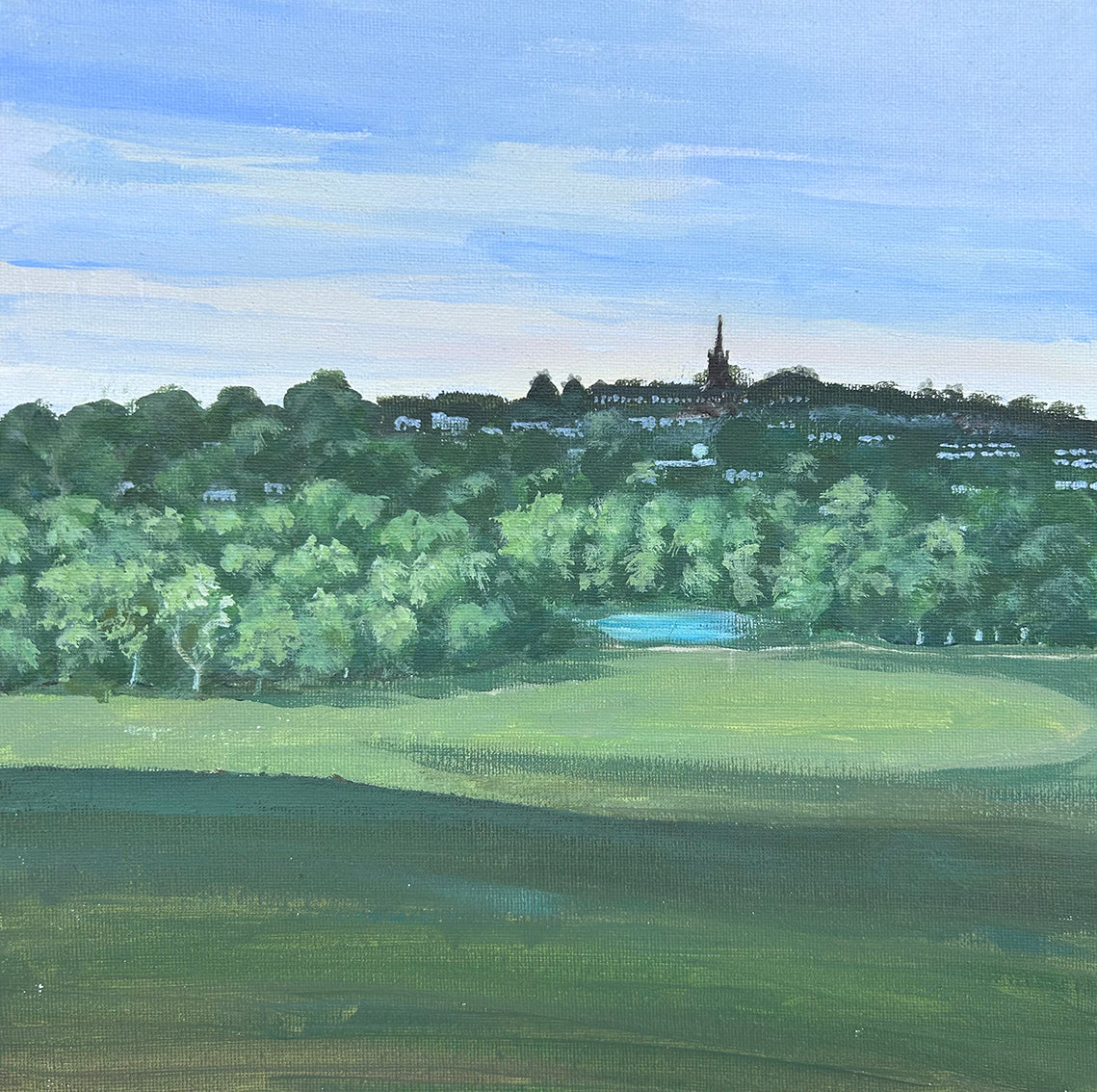Acrylic painting on canvas by Laura Price, framed, 40x40cm, depicting a view towards Highgate from Hampstead Heath. See attached photo for example of the framing. Laura Price lives and works near the heath, where she frequently finds inspiration.