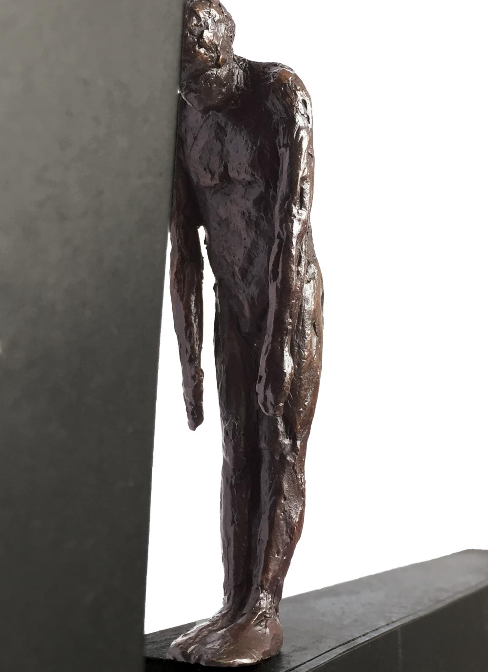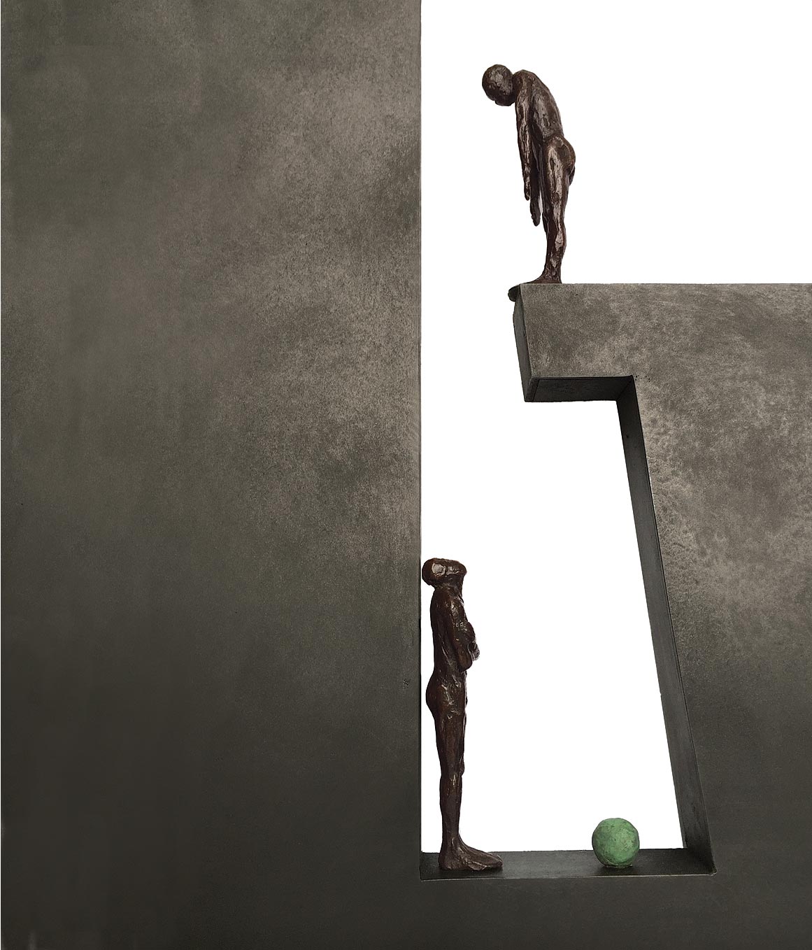 A sculpture by Laurence Perratzi, last one in an edition of 8. The figure is in bronze, the letter in stainless Steel. Laurence Perratzi is a figurative artist exploring the body’s expression. Her work is a reflection on movement strongly influenced by her athletic background where poise and balance are paramount. In her “Just a Pea” series, Laurence seeks to playfully remind us to take a second look at trivial burdens in the macrocosm of life, shrinking them to the microcosm of a pea, an uplifting admonition to ‘not stress the small things’. Laurence Perratzi's sculptures are shipped in hand-made wood boxes to protect them during transport.