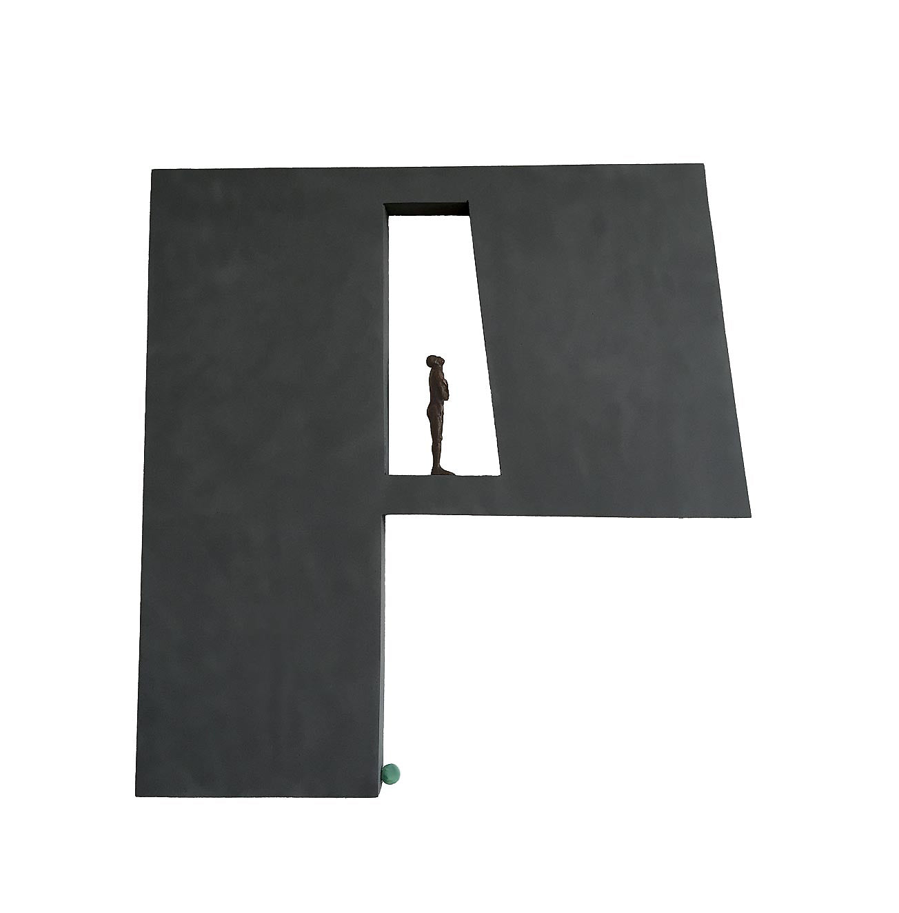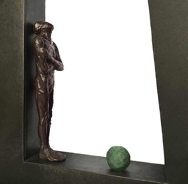 A sculpture by Laurence Perratzi, last one in an edition of 8. The figure is in bronze, the letter in stainless Steel. Laurence Perratzi is a figurative artist exploring the body’s expression. Her work is a reflection on movement strongly influenced by her athletic background where poise and balance are paramount. In her “Just a Pea” series, Laurence seeks to playfully remind us to take a second look at trivial burdens in the macrocosm of life, shrinking them to the microcosm of a pea, an uplifting admonition to ‘not stress the small things’. Laurence Perratzi's sculptures are shipped in hand-made wood boxes to protect them during transport.
