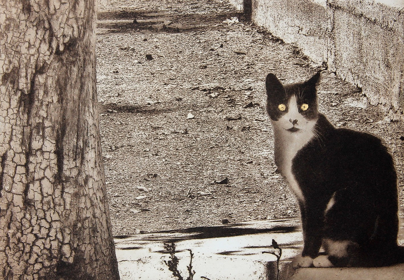 Photopolymer etching created and hand-printed printed on archival paper by despina Symeou, with hand-finished gold pigment in the cat's eyes.