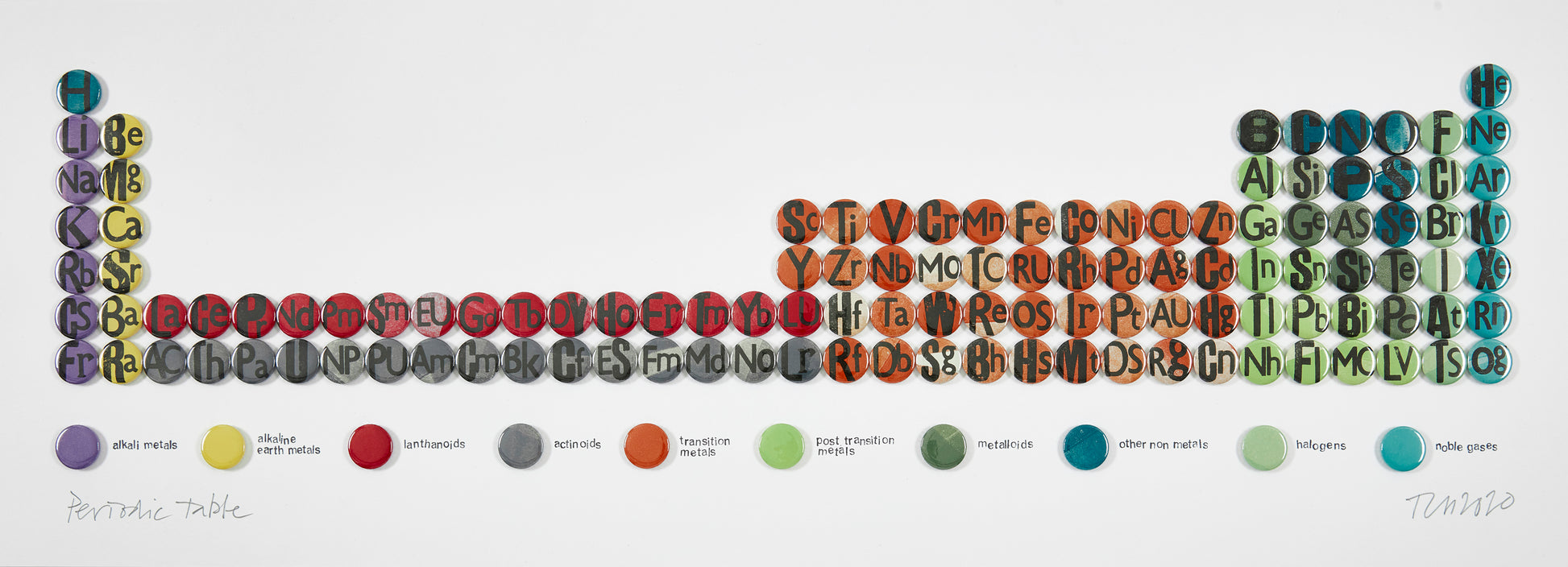 Periodic Table is a mixed media badges and letterpress artwork, created and made by Tessa Holmes. It is framed. A fascination with grids and graphs led Tessa to develop her own personal interpretation of The Periodic Table and Multiplication Table (also available on this website). These are limited edition prints – individually made with hand-stamped wooden letterpress sealed into badges. They present a unique contemporary twist to these familiar classroom classics! Because of the unique way they are hand-made, Multiplication and Periodic Table are made to order, so can take up to 3 weeks to be delivered, unless they are already in stock. We will contact you if Tessa has to make yours to order, so you know how long you may have to wait.