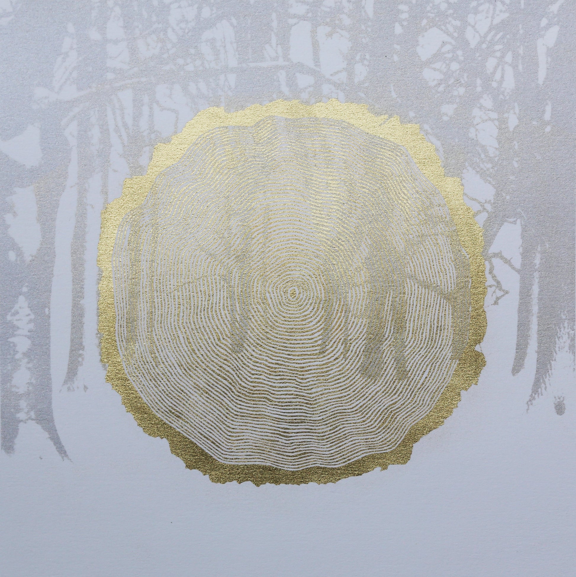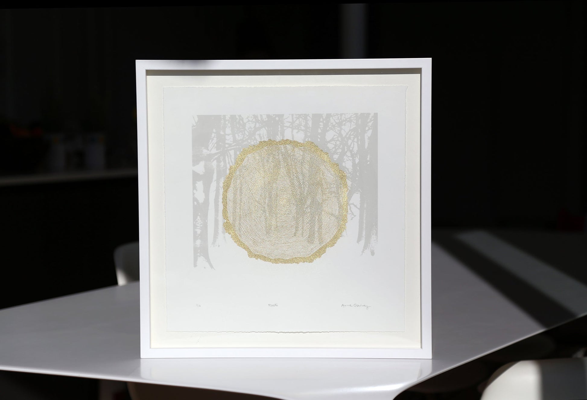 A screen print with gold pigment on Fabriano paper, in an edition of 10. Anne Gournay's work is inspired by her long walks in Hampstead Heath and her love of the outdoor. She explores patterns in nature, the ephemeral quality of life, its beauty and the traces we leave behind. The pigments are gently applied on the ink when it is fresh with a very soft brush, in order to obtain this shimmering effect. As shown in the various photos, the pigments capture the light differently depending on its direction and intensity.