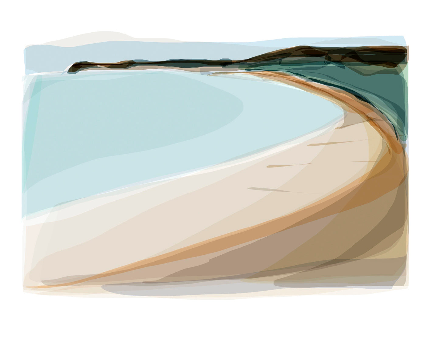 A Giclée print of Tessa Holmes' iPad drawing, in an edition of 50, signed and numbered on the front. “The Rye Bay Series”, a series of iPad drawings that explore the coastline and landscape of East Sussex, is an expanding collection that records this isolated seashore, with its wide expanse of sands, shifting lines of shingle and curious man-made structures. Working directly onto an iPad, her bold colourful images capture the beauty and solitude of this unique environment.