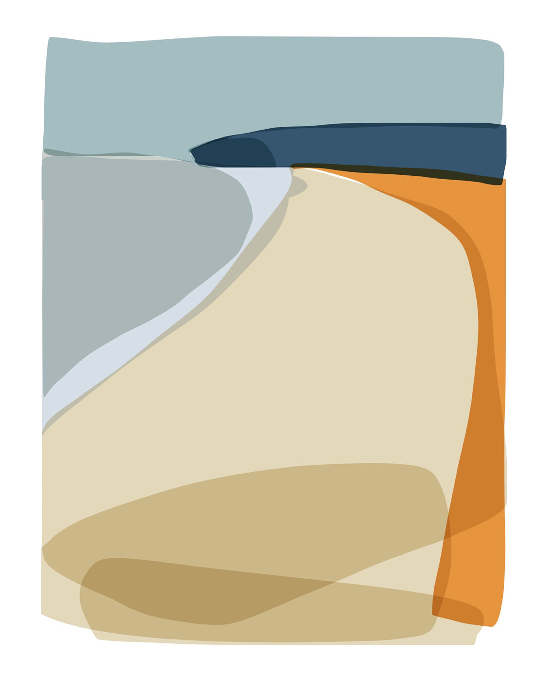 A Giclée print of Tessa Holmes' iPad drawing, in an edition of 50, signed and numbered on the front. “The Rye Bay Series”, a series of iPad drawings that explore the coastline and landscape of East Sussex, is an expanding collection that records this isolated seashore, with its wide expanse of sands, shifting lines of shingle and curious man-made structures. Working directly onto an iPad, her bold colourful images capture the beauty and solitude of this unique environment.