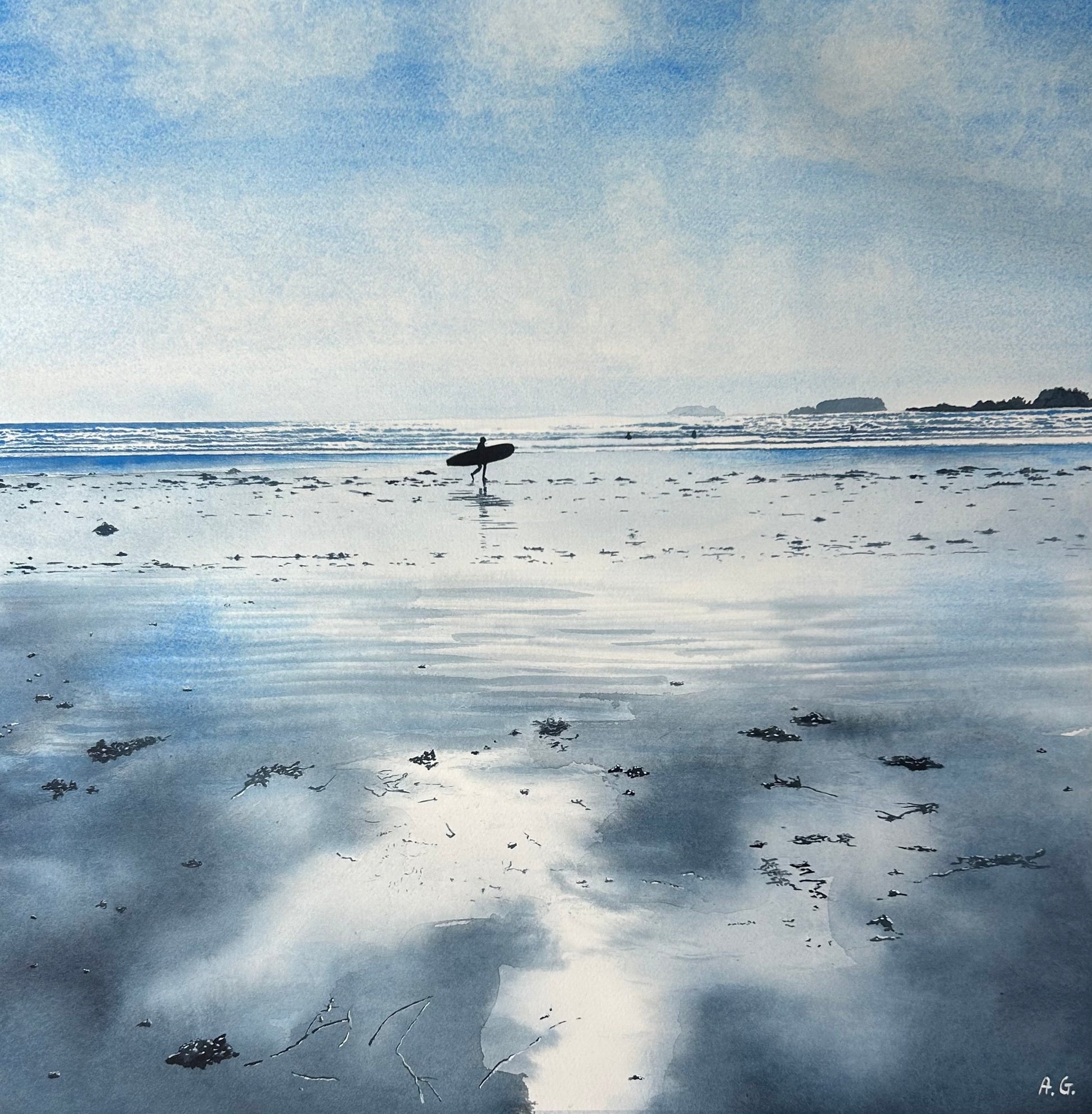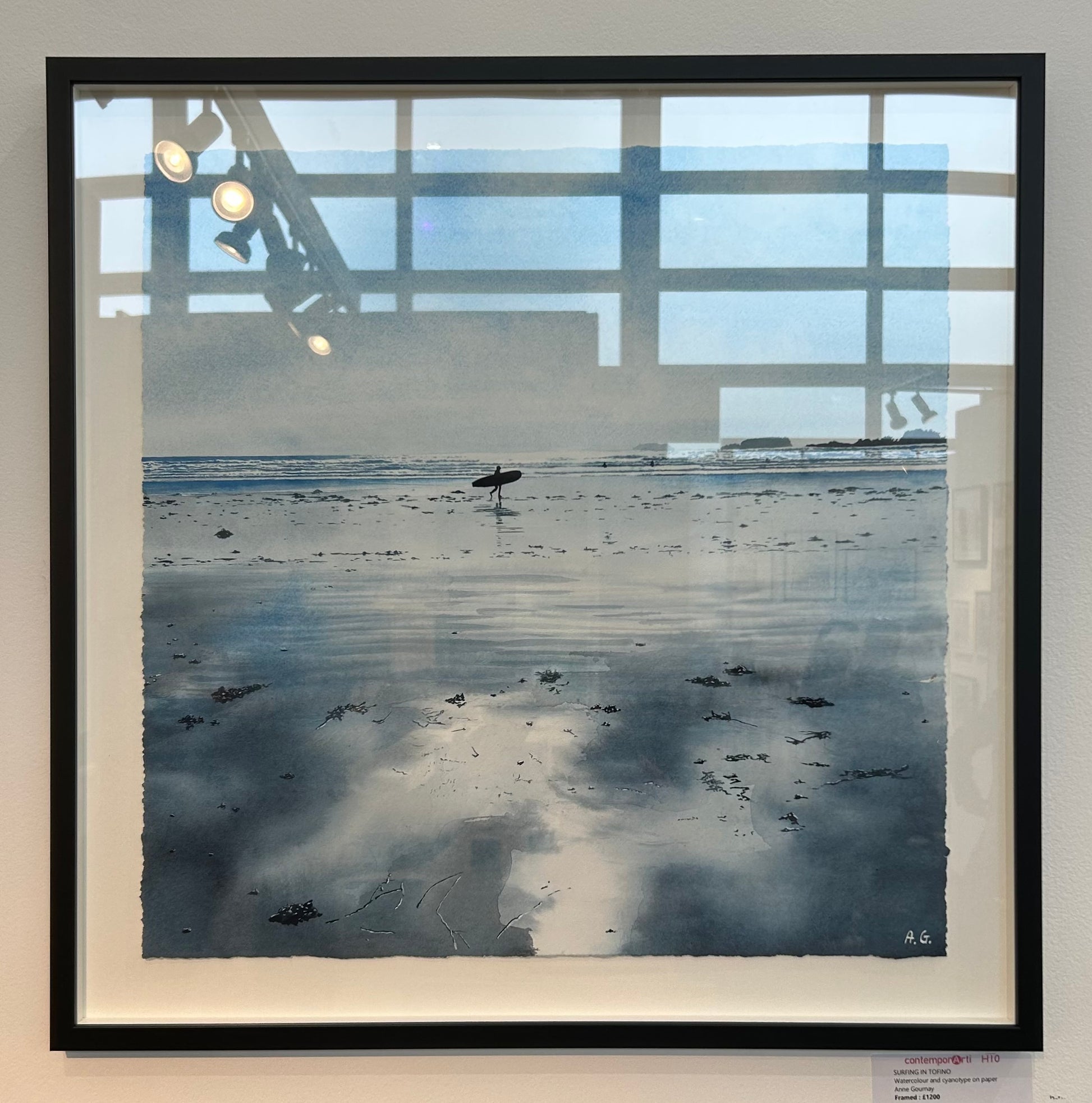 A cyanotype and watercolour painting on Saunders Waterford paper, inspired by a trip in Tofino, Vancouver Island, British Columbia. Tofino is a well known surfing spot, but the water is quite cold, even at the end of July!