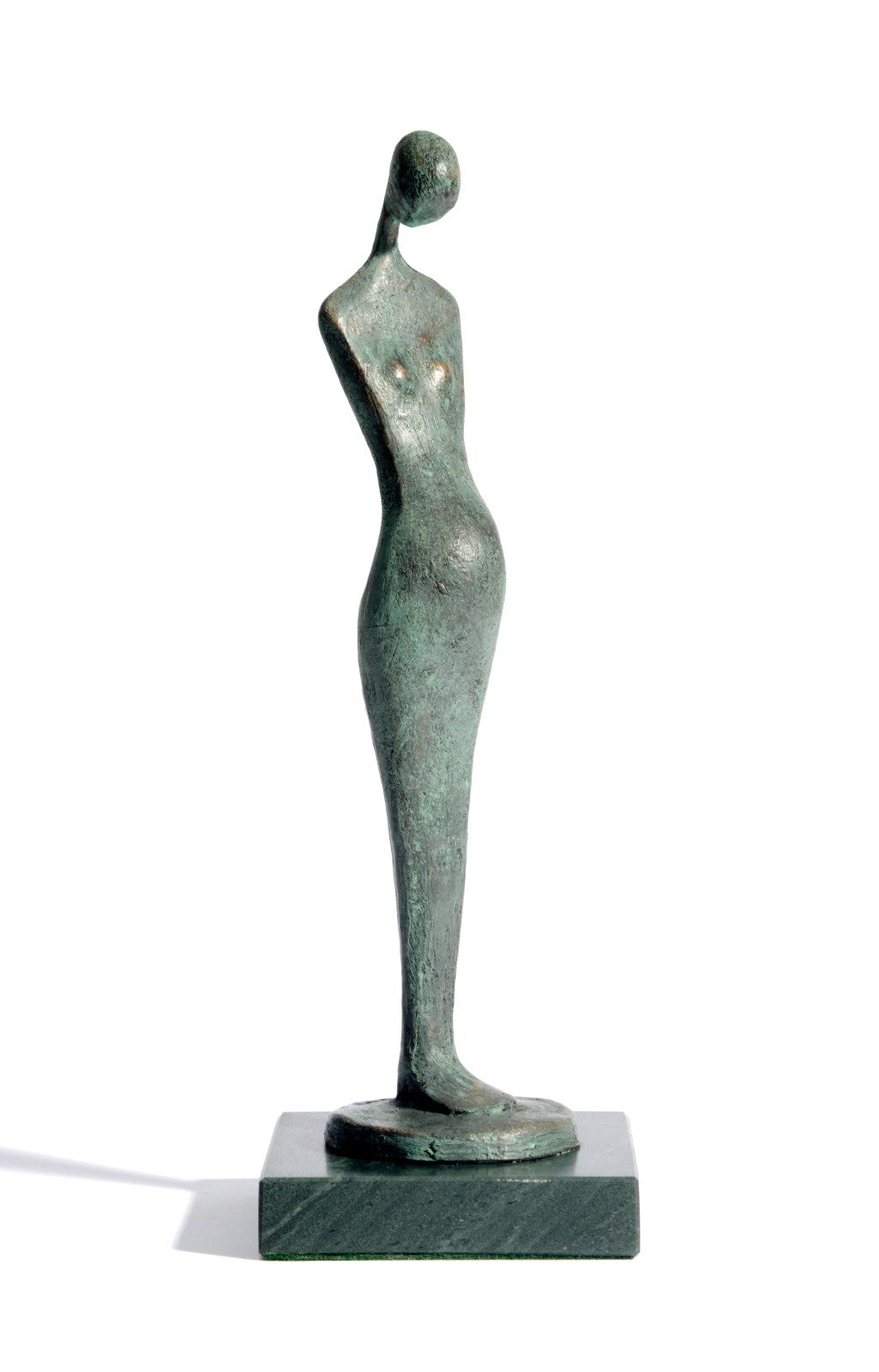 A sculpture by Jennifer Watt, created in 2017 and edited in bronze resin, and on a green slate.