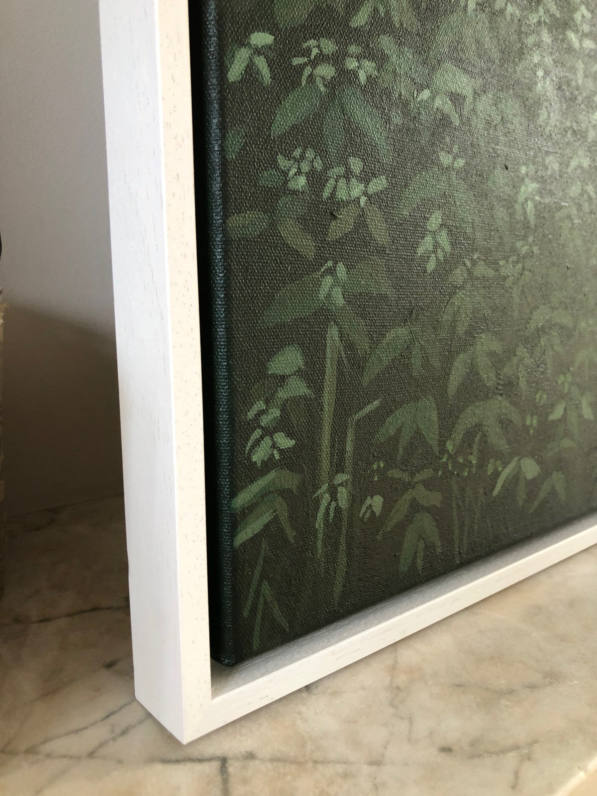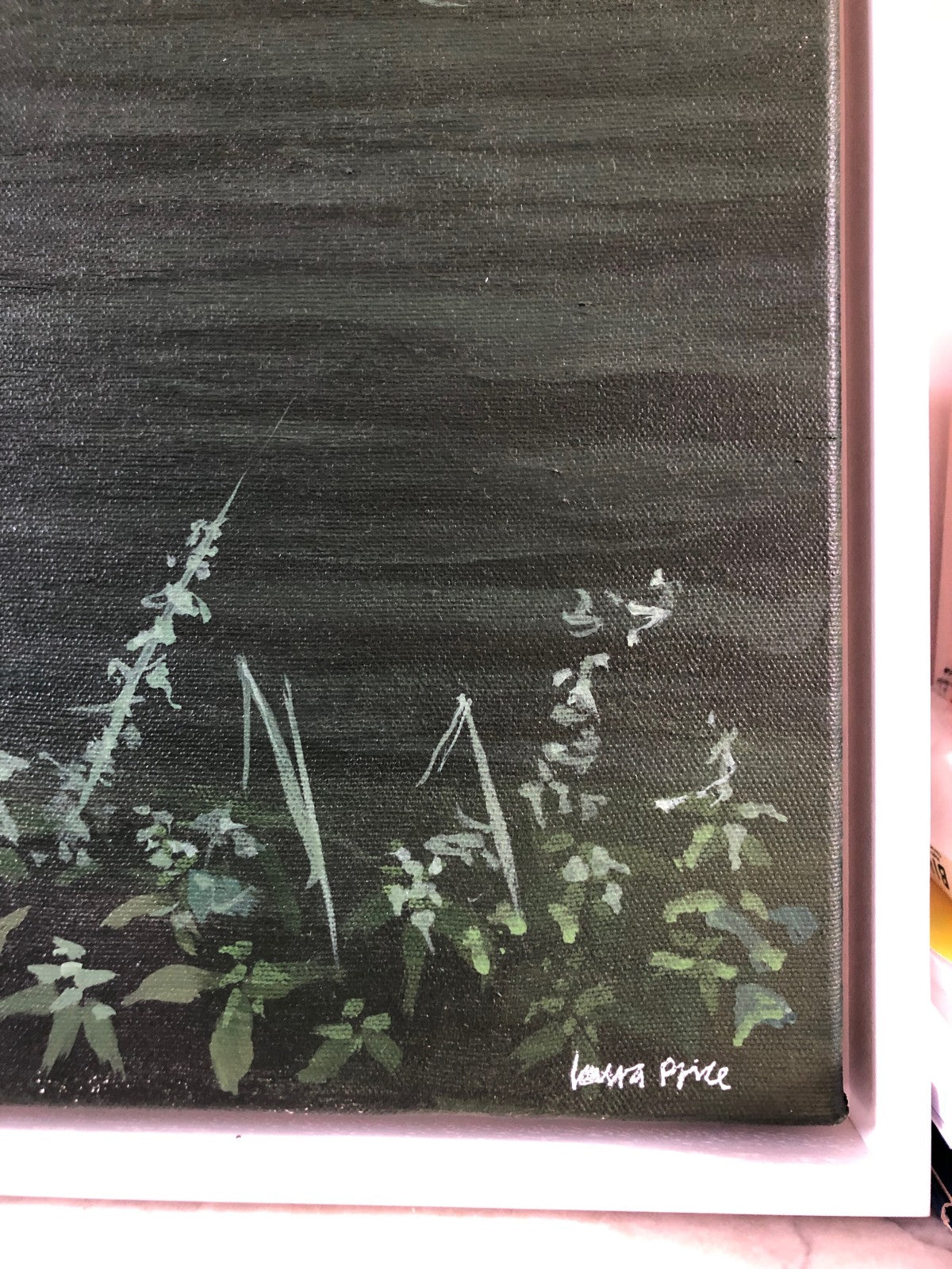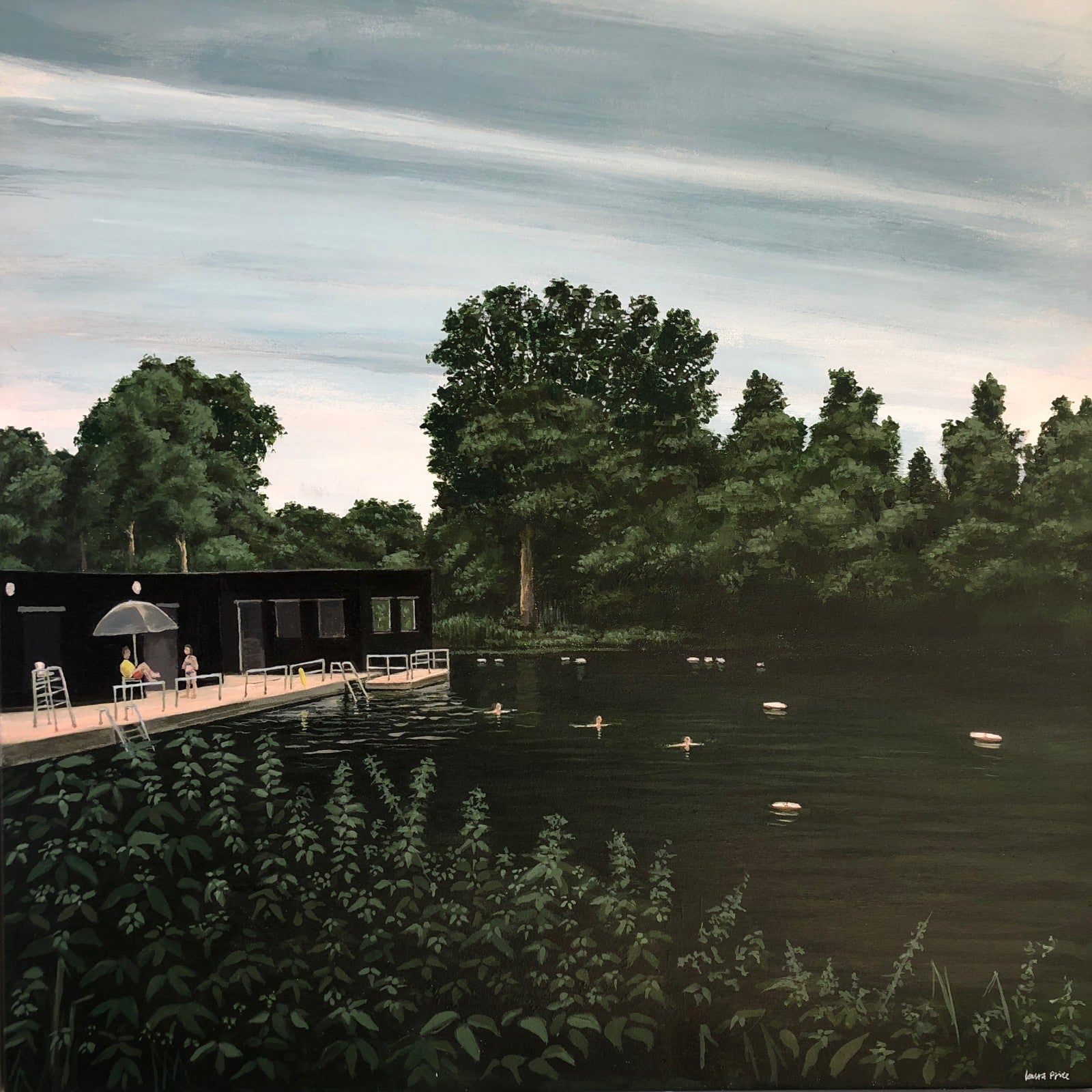 Acrylic painting on canvas by Laura Price, framed, depicting the Women's Pond in Hampstead Heath.