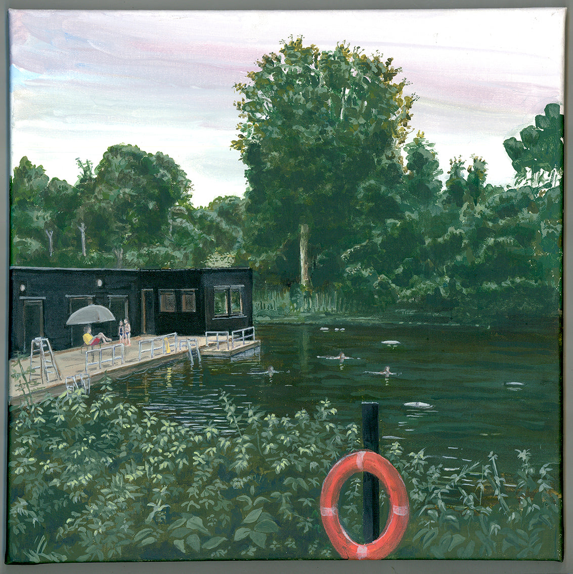 A beautiful acrylic painting on canvas by Laura Price, depicting the Women's Pond in Hampstead Heath, London. The painting is framed, and measures 40x40cm.